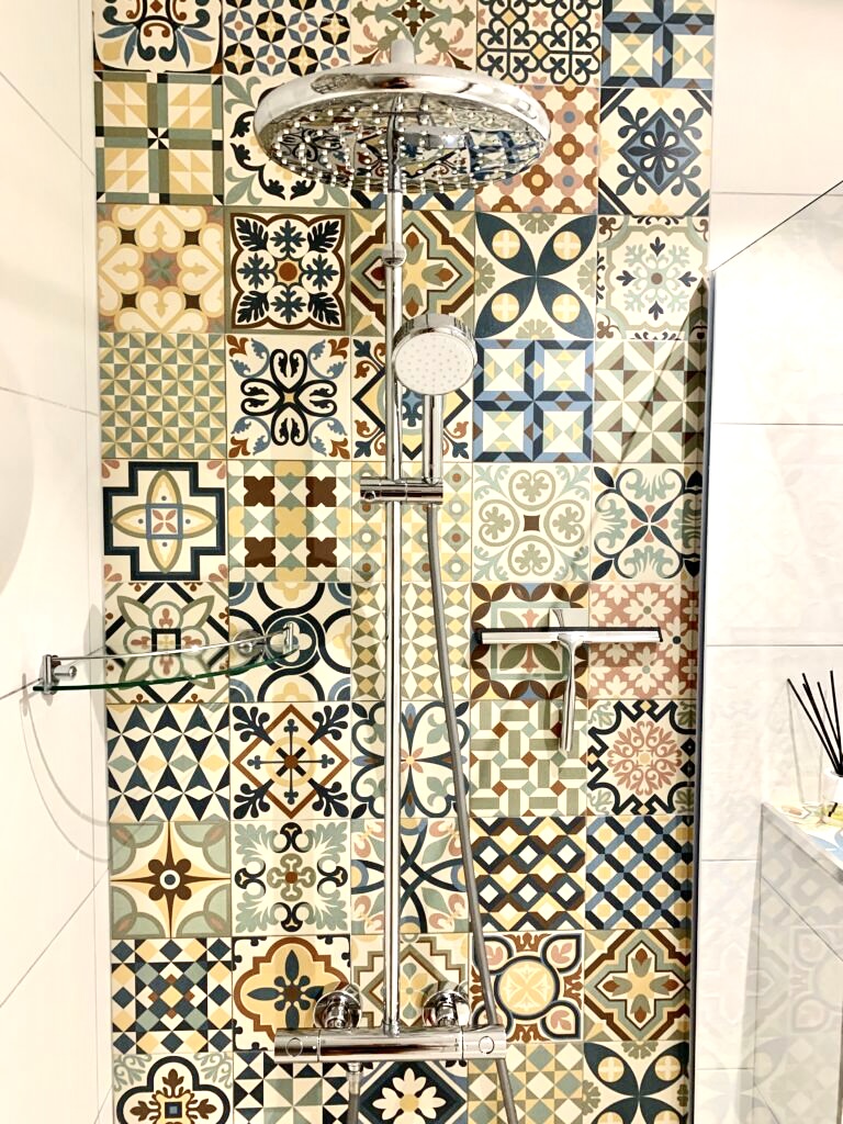 Das Badezimmer verfügt über eine große Regendusche, eine Waschmaschine und einen Haartrockner.