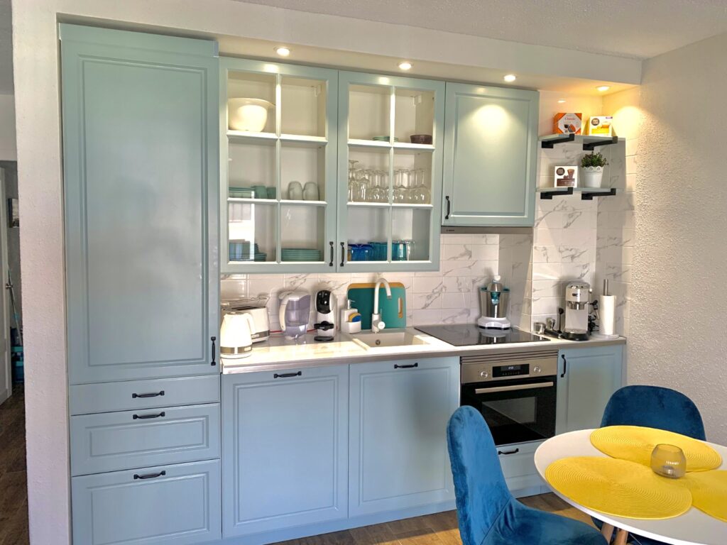 Die Küchenzeile ist mit hochwertigen Küchengeräten ausgestattet, nämlich: einem Kühlschrank mit Gefrierfach, einem Backofen mit Mikrowellenfunktion und einem Induktionskochfeld. Zur weiteren Ausstattung gehören: ein Geschirrspüler, Wasserkocher, Toaster, Kaffeemaschine, Zitruspresse, Blender und alle notwendigen Utensilien (Kaffee- und Speiseservice, Töpfe, Pfannen, Besteck, Gläser ).
